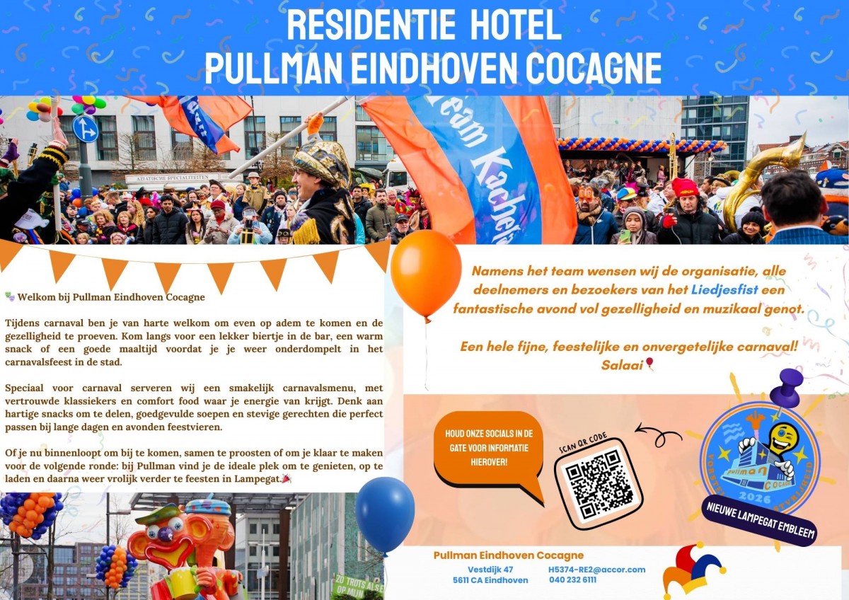 Kom langs, geniet van de sfeer, en maak carnaval 2026 onvergetelijk bij Pullman Eindhoven Cocagne. We zien je graag bij Restaurant Vestdijk47 & Bar47.